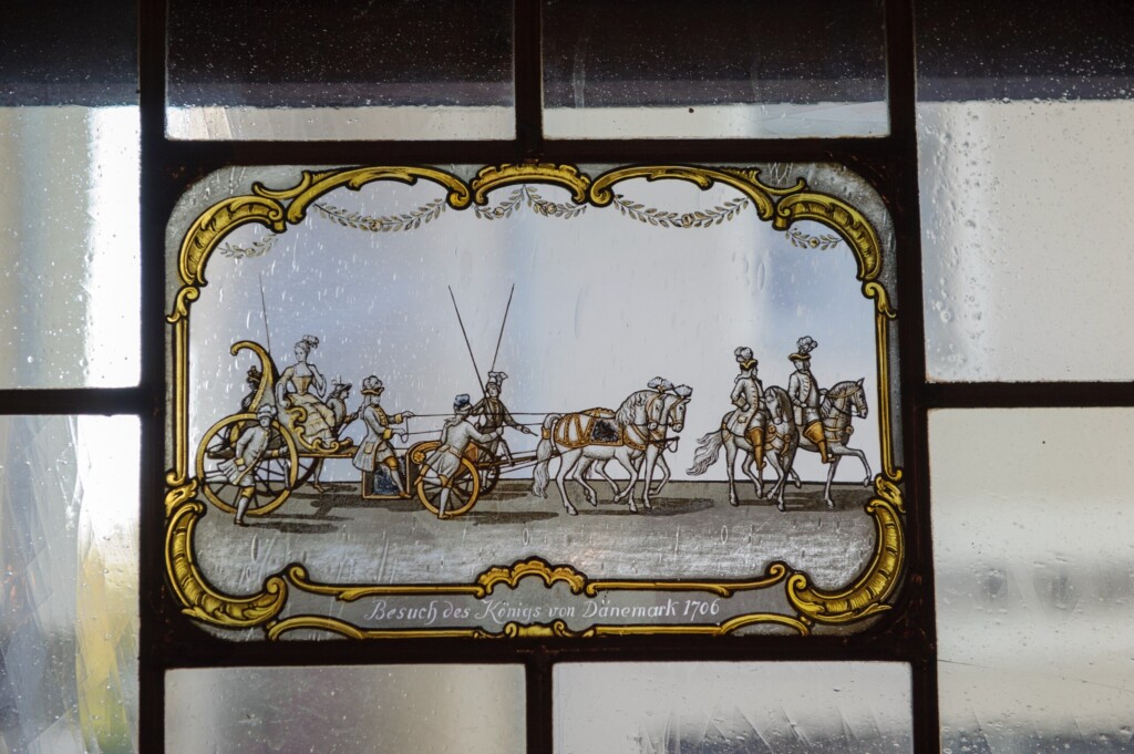 Im Jahre 1706 ereignete sich der Besuch des Königs von Dänemark, woran die Bleiglasfenster im Löwen erinnern.
